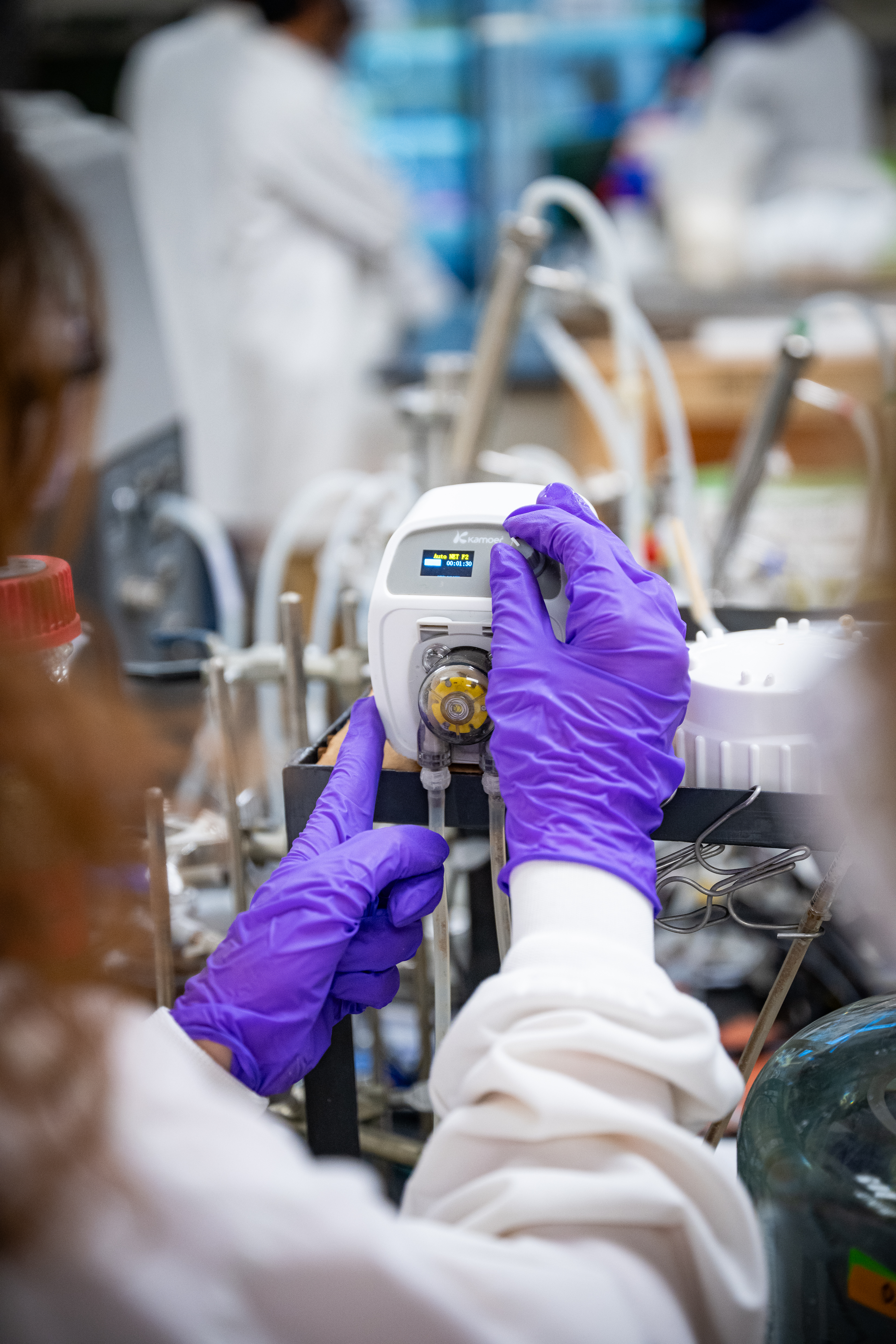 A student in Prathap Parameswaran’s laboratory sets the pump flow rate prior to reactor operation. | Download this photo.