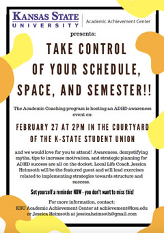 The Academic Coaching program will host an attention deficit hyperactivity disorder awareness event aimed at spreading awareness and demystifying myths surrounding ADHD. The event will be at 2 p.m. Feb. 27 in the K-State Student Union courtyard.