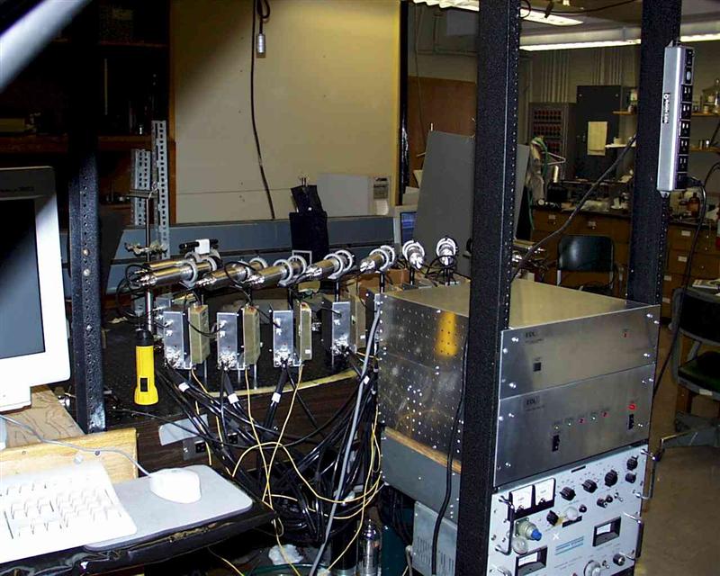 The system measures the energy and peak intensity of a scattered laser over angles up to 90 degrees from the source. EDL designed electronics are used to amplify the output of photo multiplier tubes. The system has a dynamic range of over 1000:1