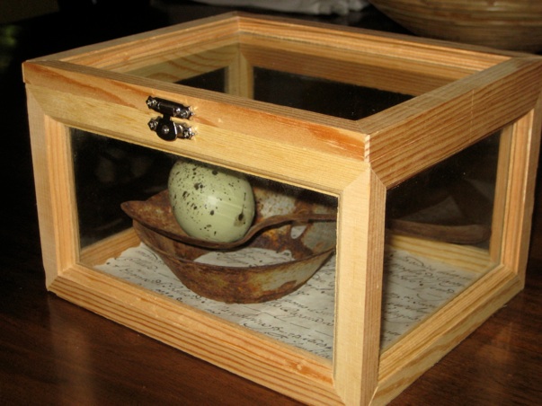 My Habitat Series is an homage to domestic identity and place in tableaux of paper and rust housed in transparent boxes.