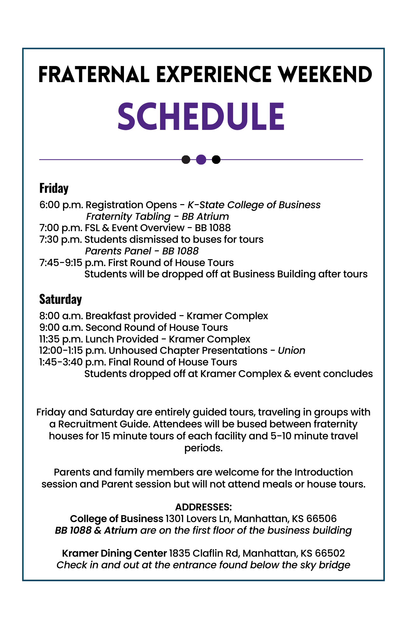 Programming includes: Fraternity and Sorority Life Overview, Tabling and mingling with all fraternity chapter recruitment chairs and chapter leadership, Parent Info Meeting, Q&A, and touring ~4 chapter houses.