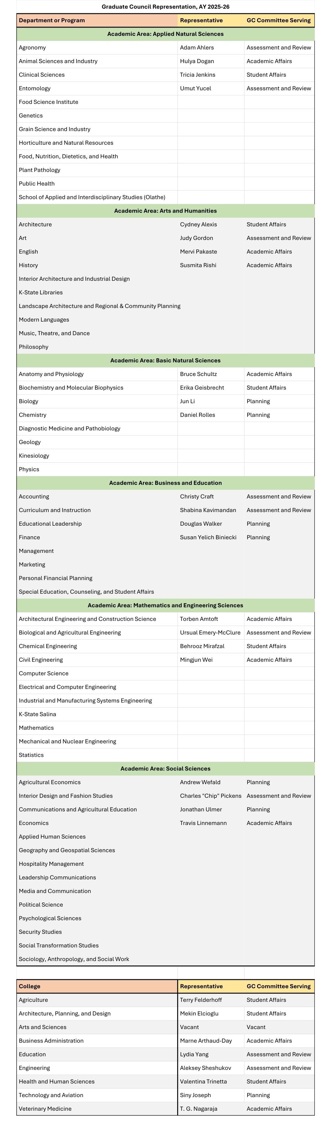 The Graduate Faculty is organized into Academic Areas for the purposes of electing representatives to the Graduate Council. These Academic Areas, which form constituencies for representation to Graduate Council, ensure that educational and scholarly variety between disciplines is represented in all Graduate Council deliberations. The Graduate Faculty members also have membership in colleges.