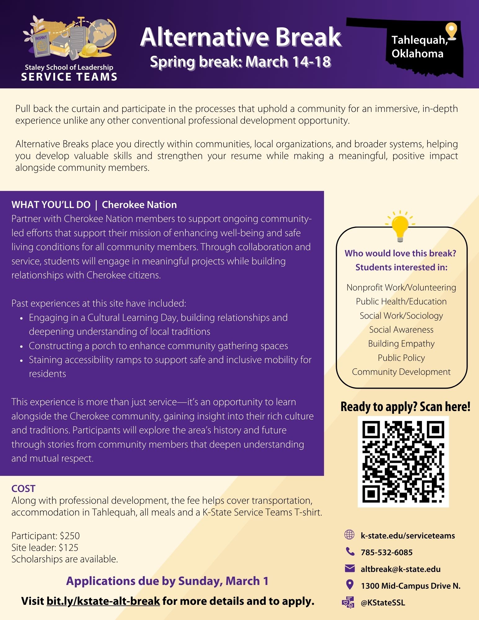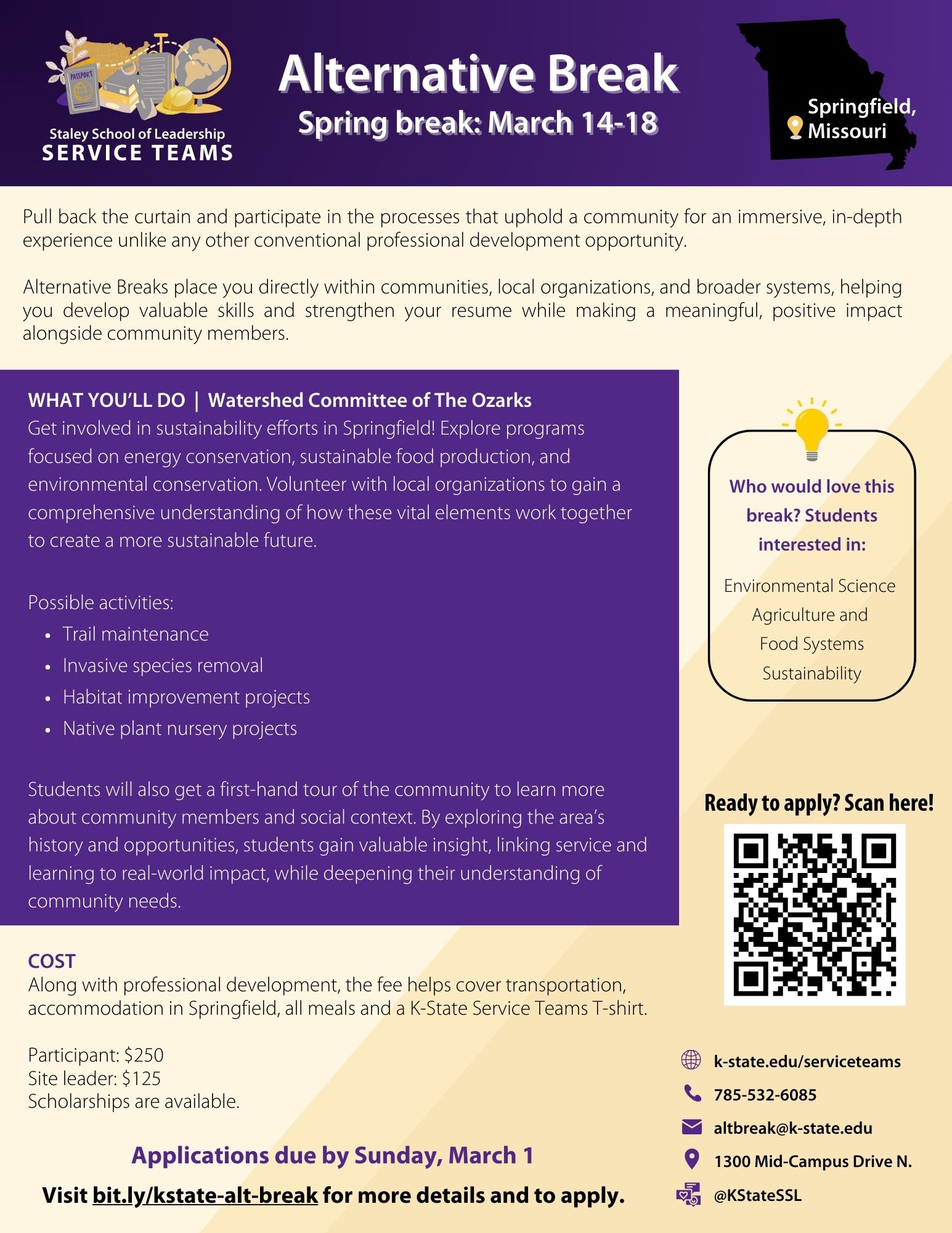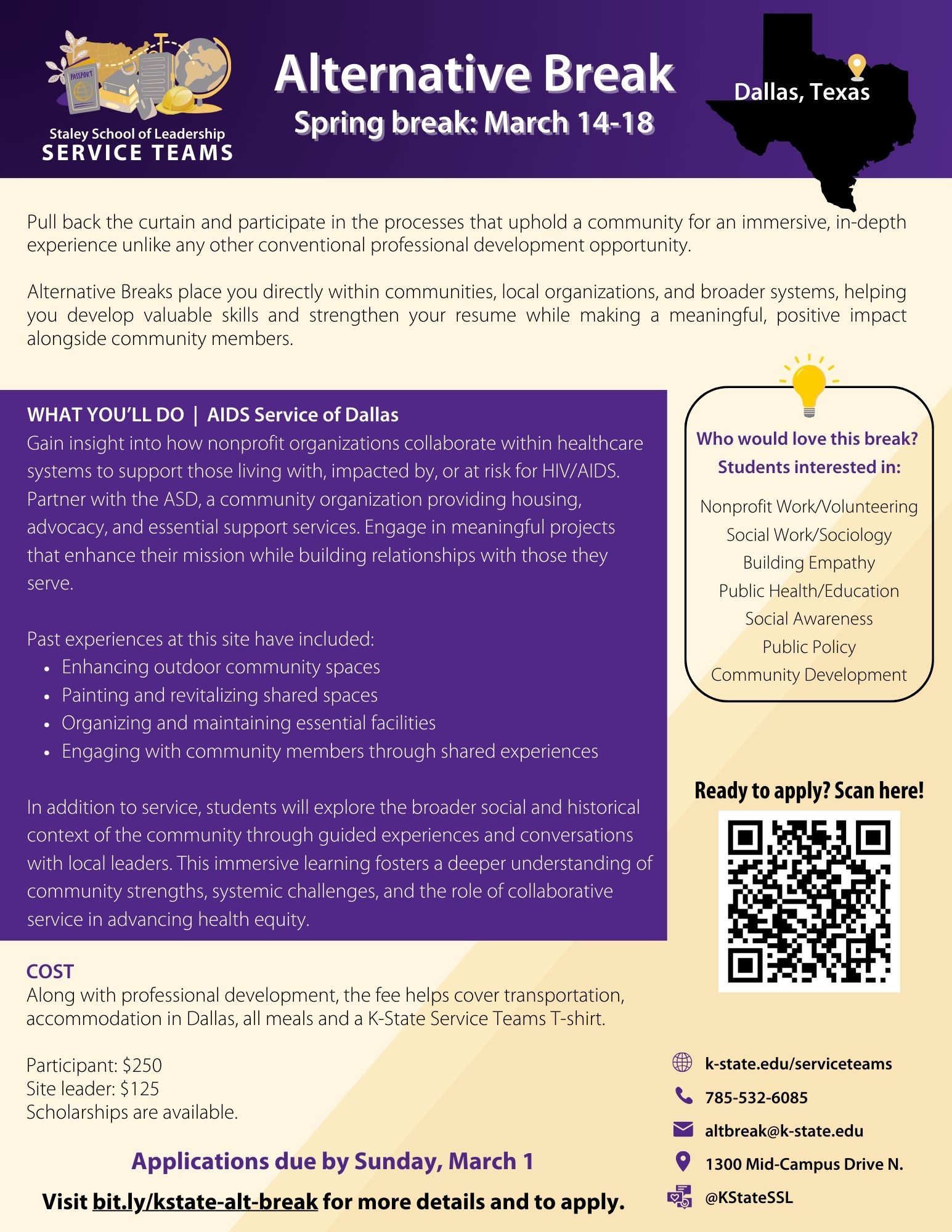 Choose from one of these locations during K-State's Spring Break. If you have more questions or would like to talk to our team, email altbreak@ksu.edu to schedule an appointment.