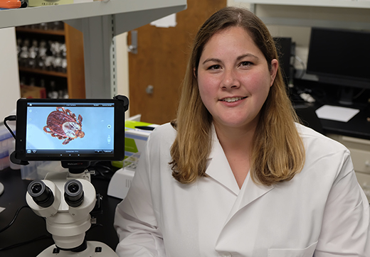 Kathryn Reif, assistant professor in the diagnostic medicine and pathobiology department in the Kansas State University College of Veterinary Medicine, is leading a project that focuses on optimizing antimicrobial use to control active infection of the hemoparasitic pathogen, Anaplasma marginale, the causative agent of bovine anaplasmosis. The research is supported by a nearly $1.2 million grant from the U.S. Department of Agriculture. | Download this photo.