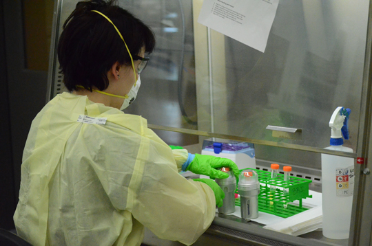 A student in a biosecurity training lab at Kansas State University's Biosecurity Research Institute as part of a plant biosecurity course emphasizing wheat blast. The biosecurity training lab contains no live agents. | Download this photo.