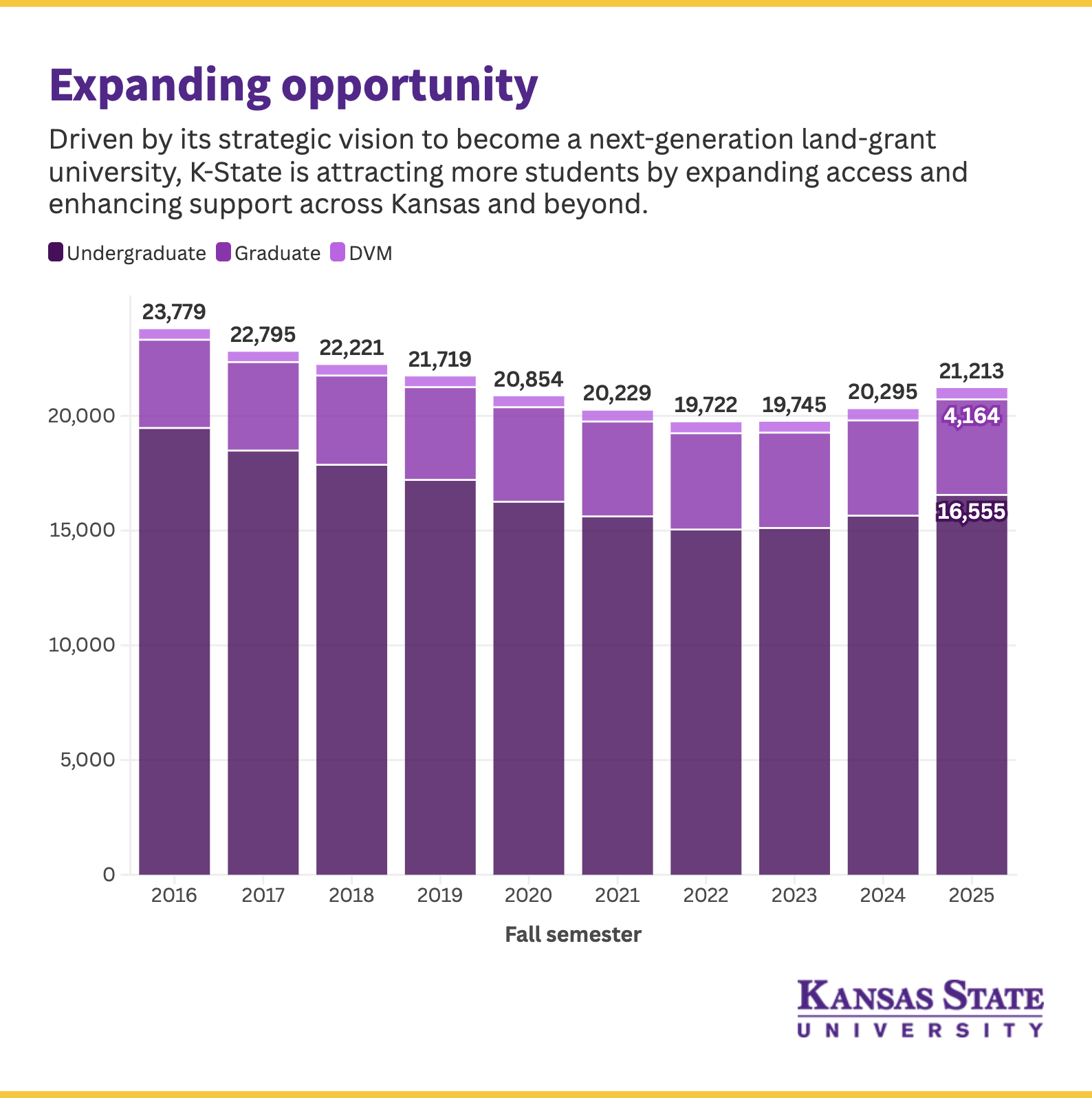The university's focus on increasing access to education is a key driver in the overall 4.5% enrollment increase across all campuses. As the next-generation land-grant university, K-State is offering and developing educational opportunities to meet the economic and workforce needs of Kansas and the nation.