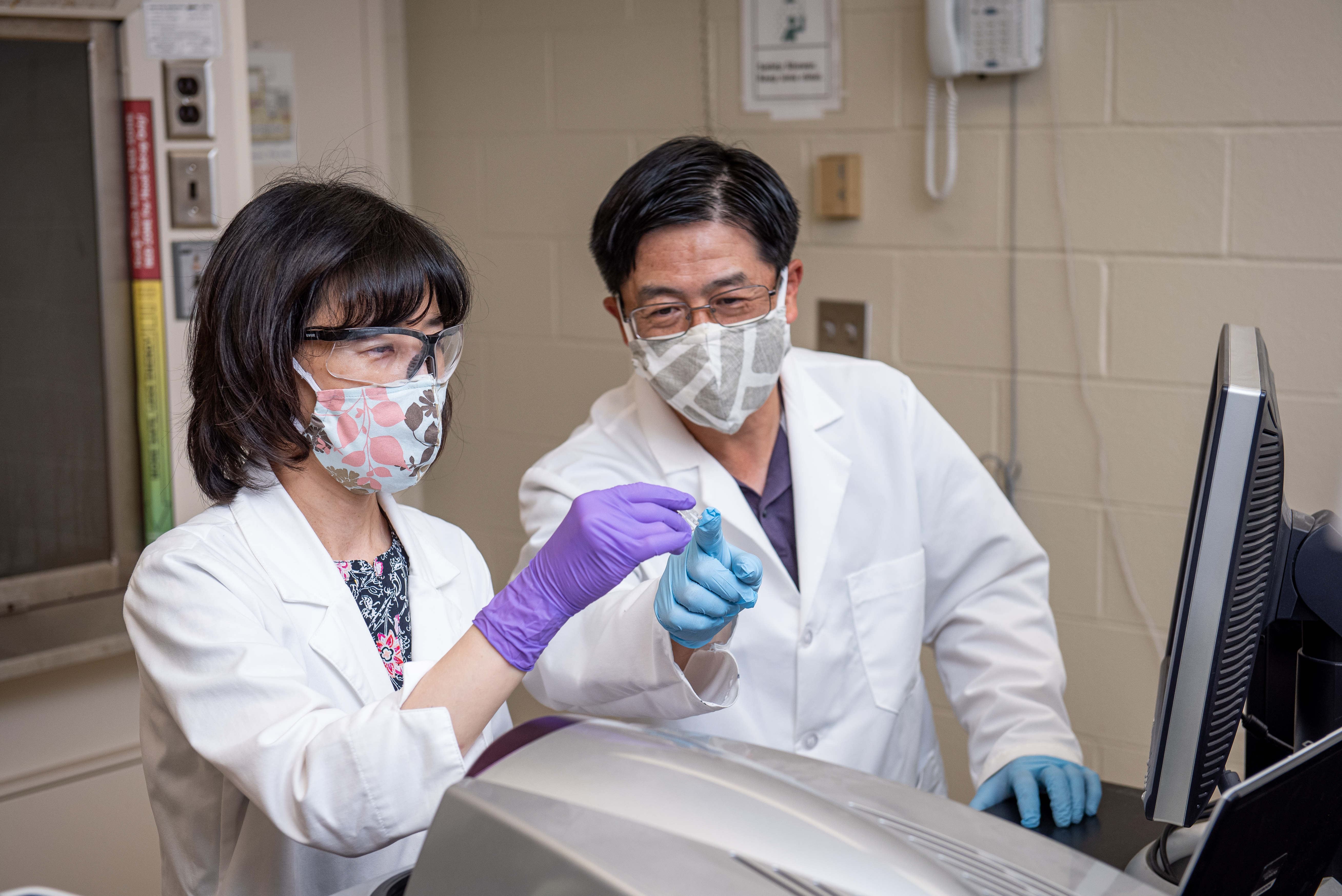 Yunjeong Kim, left, and Kyeong-Ok "KC" Chang, both virologists in the Kansas State University College of Veterinary Medicine who have developed broad-spectrum protease inhibitors that have been selected as the preclinical lead compound for further development by Cocrystal Pharma. | Download this photo.