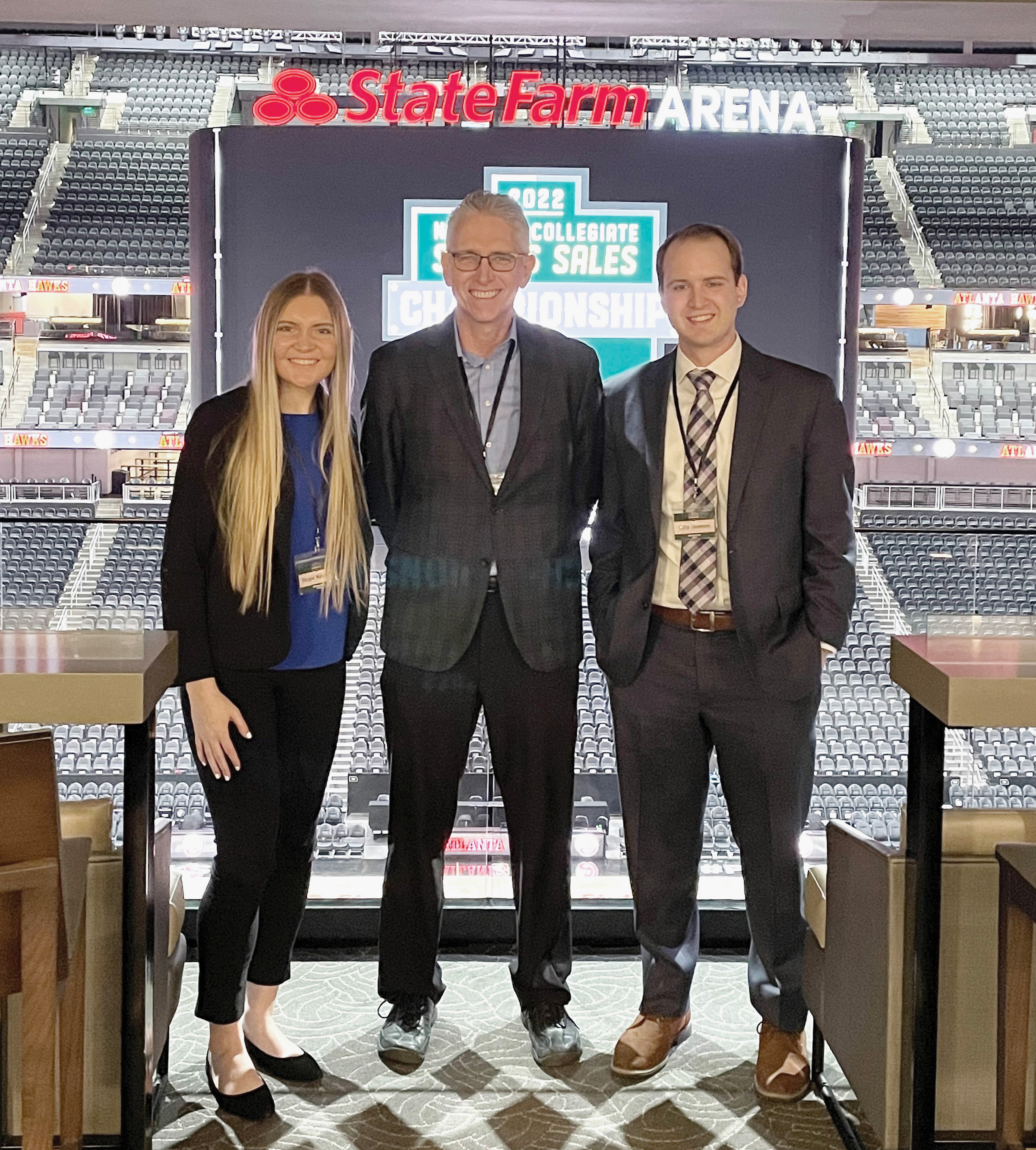 Morgan Waterman, left, and Collin Thompson, right, at the National Sports Sales Championship in Atlanta. They were accompanied by Doug Walker, center, associate professor of marketing. | Download this photo.