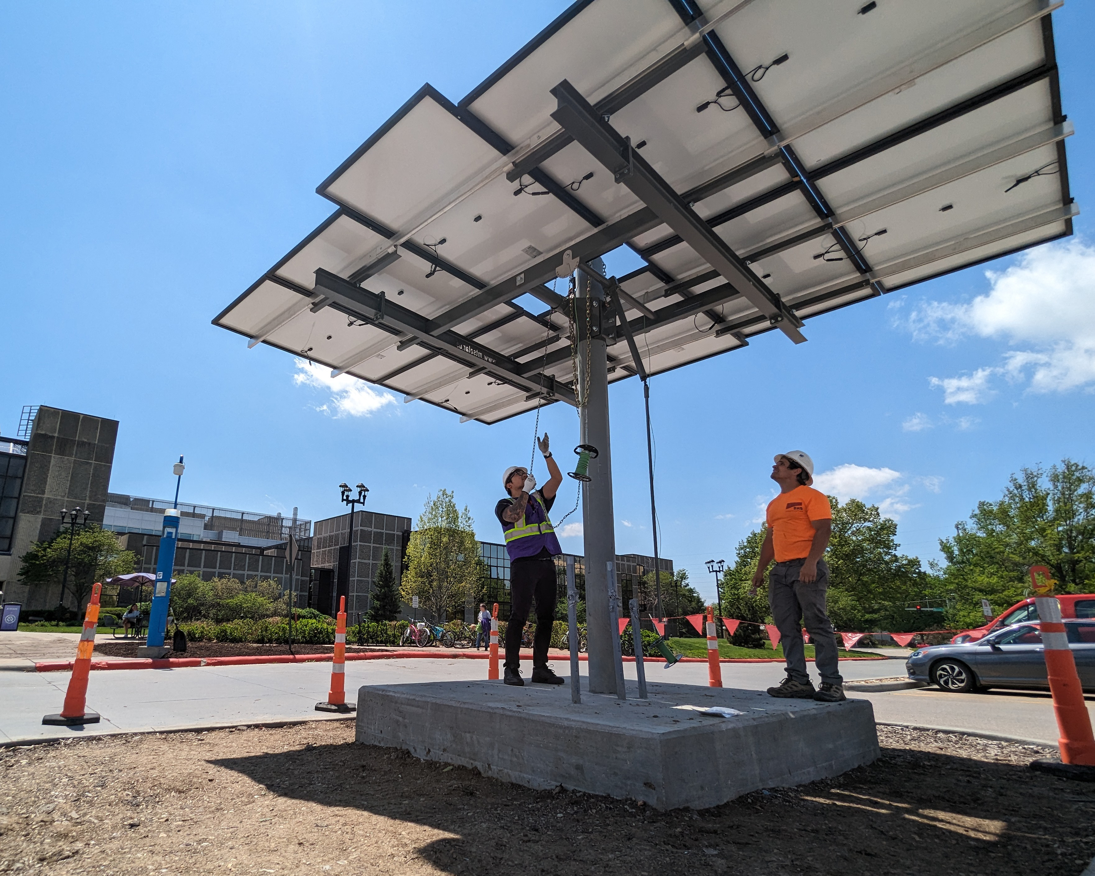 Gibson Yu, a spring 2024 graduate in architectural engineering, helps workers with BHS Construction hoist a solar panel array atop a metal column in late April 2024. | Download this photo.