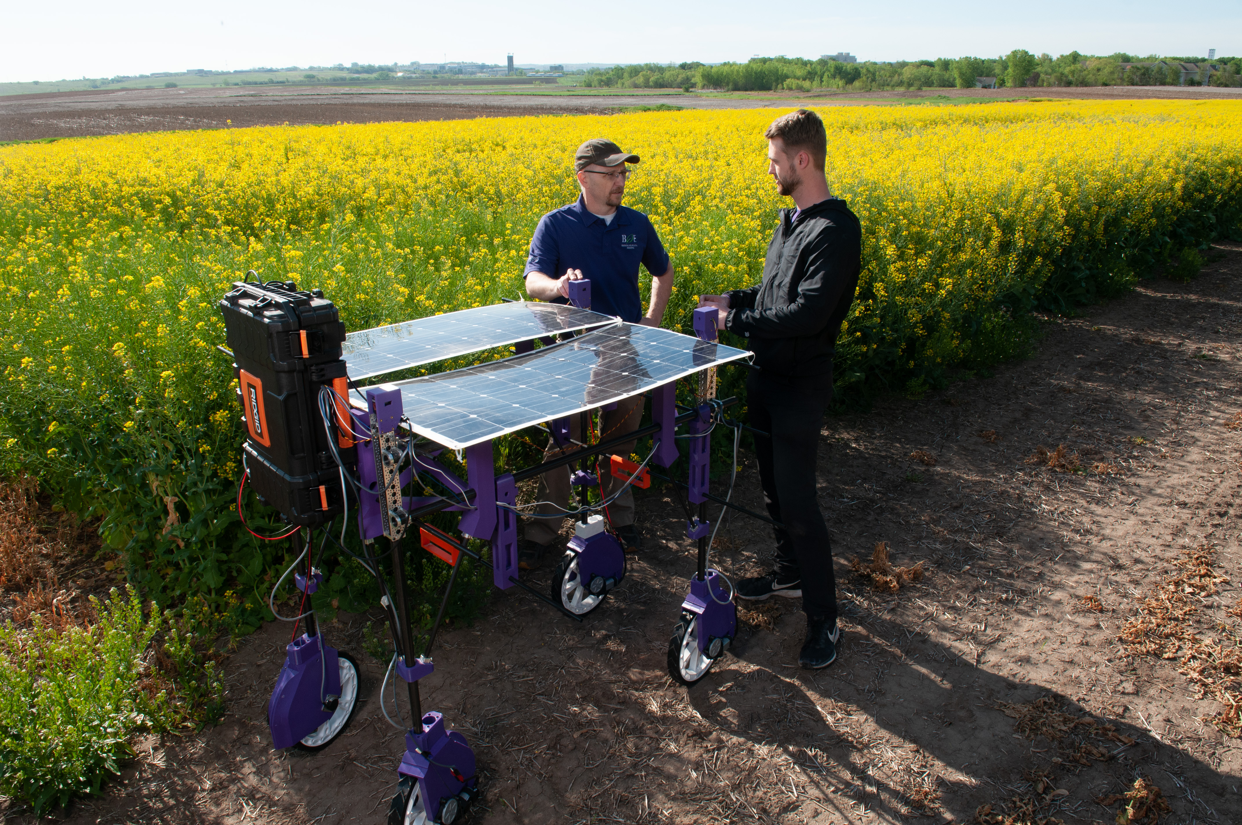 Dan Flippo, assistant professor in K-State’s department of biological and agricultural engineering, and master's student Calvin Dahms work with mesh robotic technology that uses a large, electro-magnetic sensor to measure soil properties in wheat fields. | Download this photo.