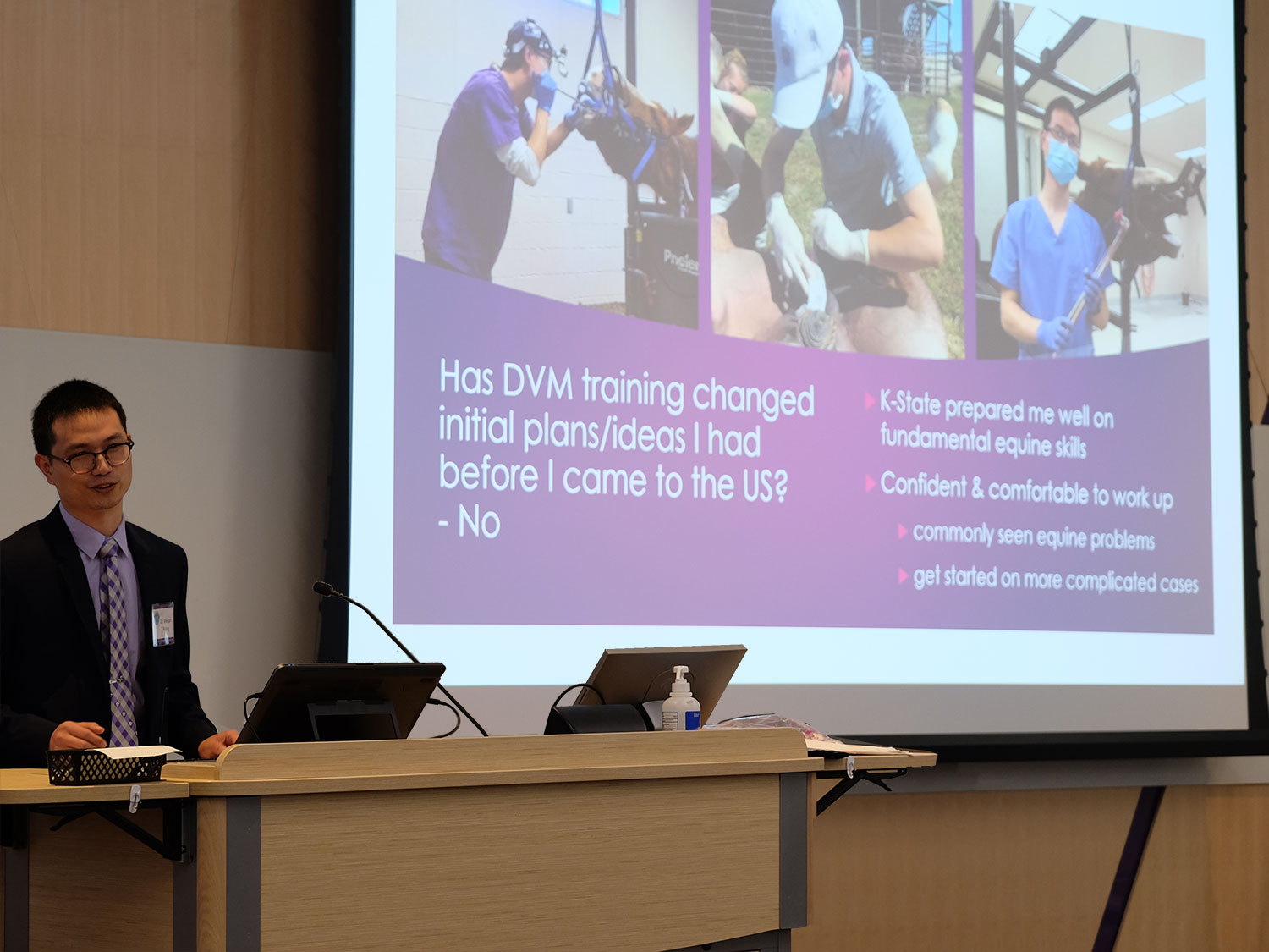 Weihan Wang, a new Kansas State University Doctor of Veterinary Medicine graduate, speaks at the annual homecoming celebration of the U.S.-China Joint Doctor of Veterinary Medicine Program in May at K-State. Wang plans to work in equine medicine when he returns to his native China. | Download this photo.