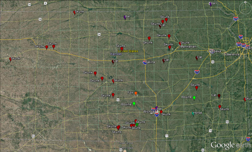 This map shows the locations of rabies positive animals found in Kansas in the past six months, including a cat in Wabaunsee County in late June. | Download this photo.