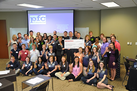 Representatives from State Farm Insurance and Kansas State University's Powercat Financial Counseling, including the service's peer financial counselors, with a check for $20,000 from State Farm to benefit the free financial counseling service for students at the university. | Download this photo.