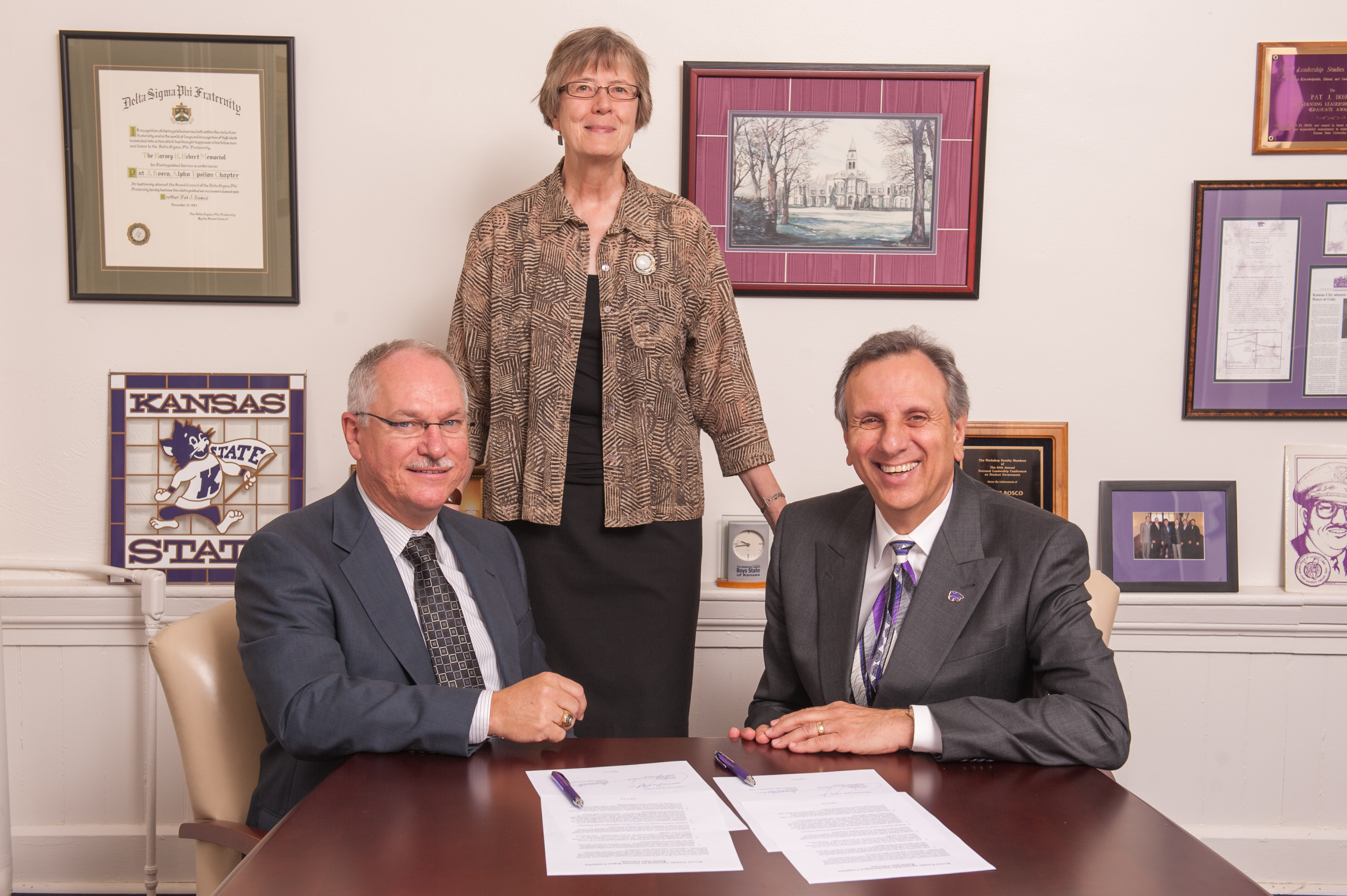 Photo cutline, both photos: From left: Duane Dunn, president of Seward County Community College; Sue Maes, dean of the Division of Continuing Education at Kansas State University; and Pat Bosco, vice president for student life and dean of students at Kansas State University, make a reverse transfer agreement between both schools official.