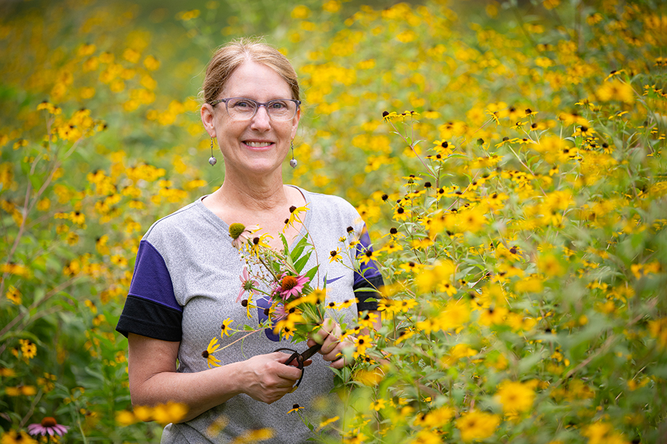 Dye materials can grow in most unmowed areas. A half-acre meadow of native prairie just north of the Marianna Kistler Beach Museum of Art has been one of Haar’s favorite spots for the last 10 years. There, she can collect daisy fleabane, brown- and black-eyed Susans and her favorite, plains coreopsis.