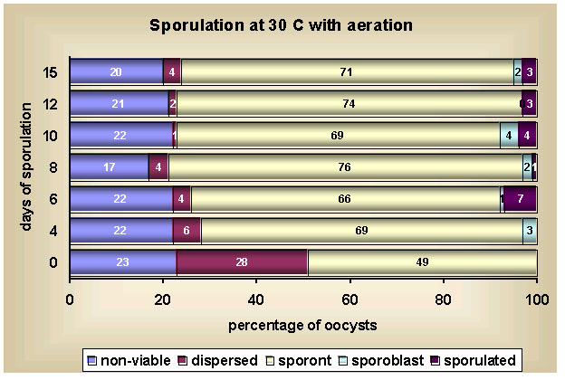 Conclusions: Oocysts sporulate well at 25 C, and tend to sporulate poorly at 30 C and not at all at 35 C. Bubbling air into cultures does not improve sporulation and may actually interfer with the process, and indeed simply swirling flasks periodically provides adequate aeration for sporulation to occur.