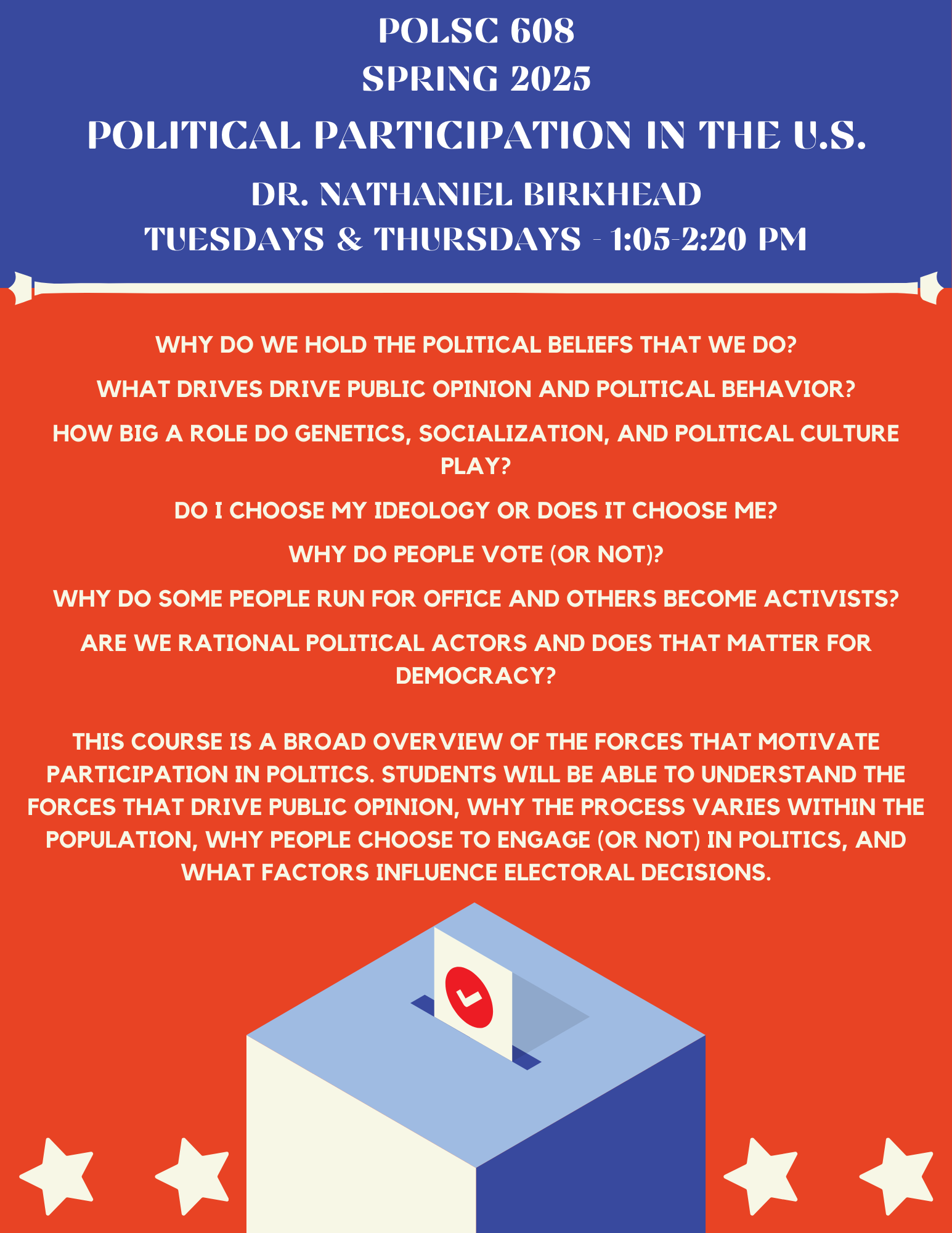 POLSC 608 - Political Participation in the United States Dr. Nathaniel Birkhead TuTh 1:05-2:20 PM This is an approved Primary Texts Certificate course! |