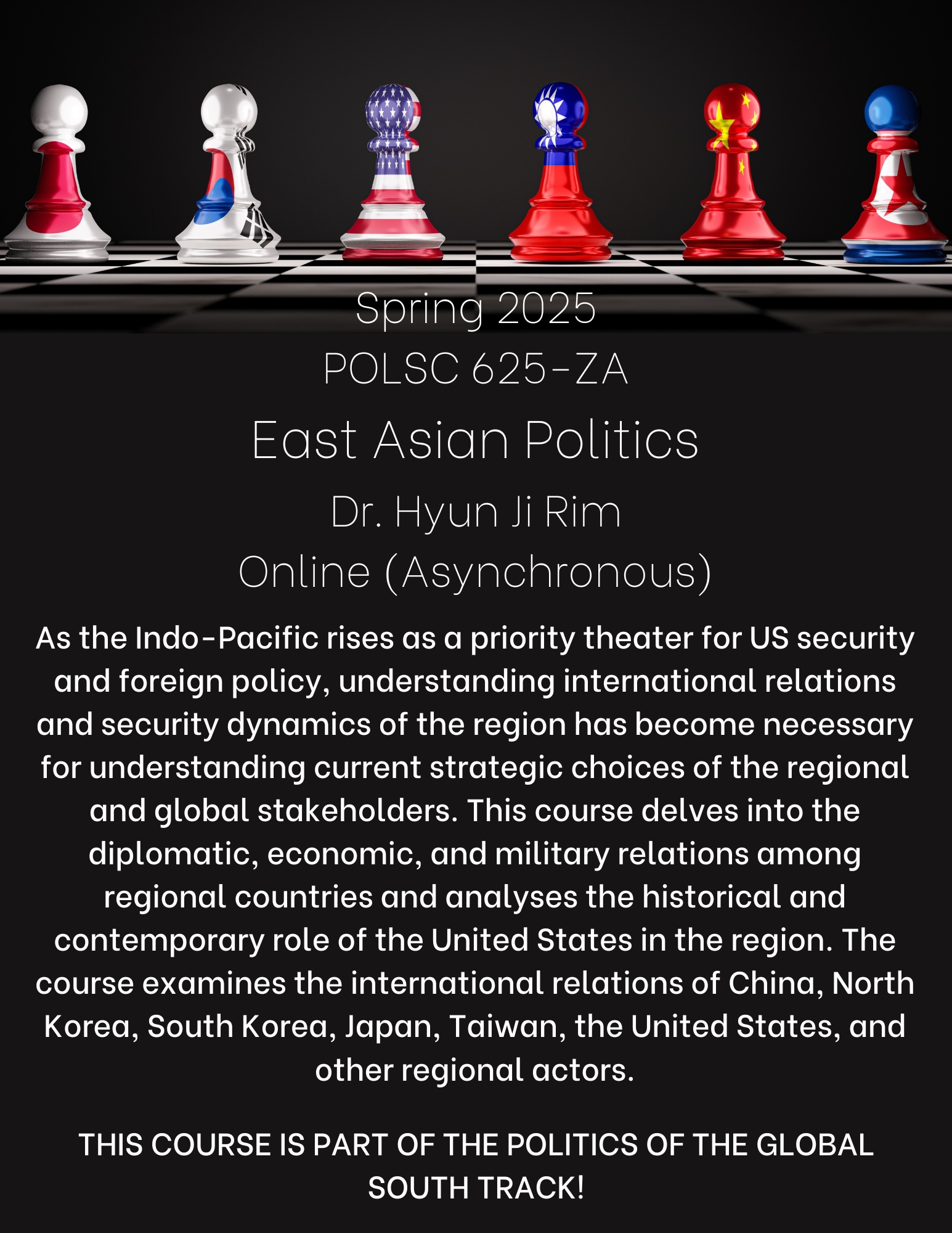 POLSC 625 - East Asian Politics Dr. Hyun Ji Rim Online - Section ZA This course is part of the Politics of the Global South track! |