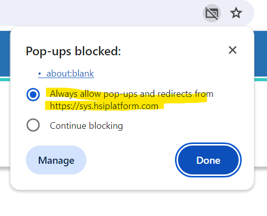 . - To always see pop-ups for the site, select Always allow pop-ups and redirects from [site] Done.