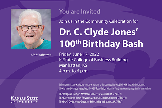 The K-State community is cordially invited to celebrate the 100th birthday of C. Clyde Jones, first and emeritus Dean of the College of Business. The event will take place from 4-6 p.m. June 17 in the College of Business atrium. This event will celebrate Jones and his many contributions to the College of Business, Kansas State University and the Manhattan community since his arrival in 1960.