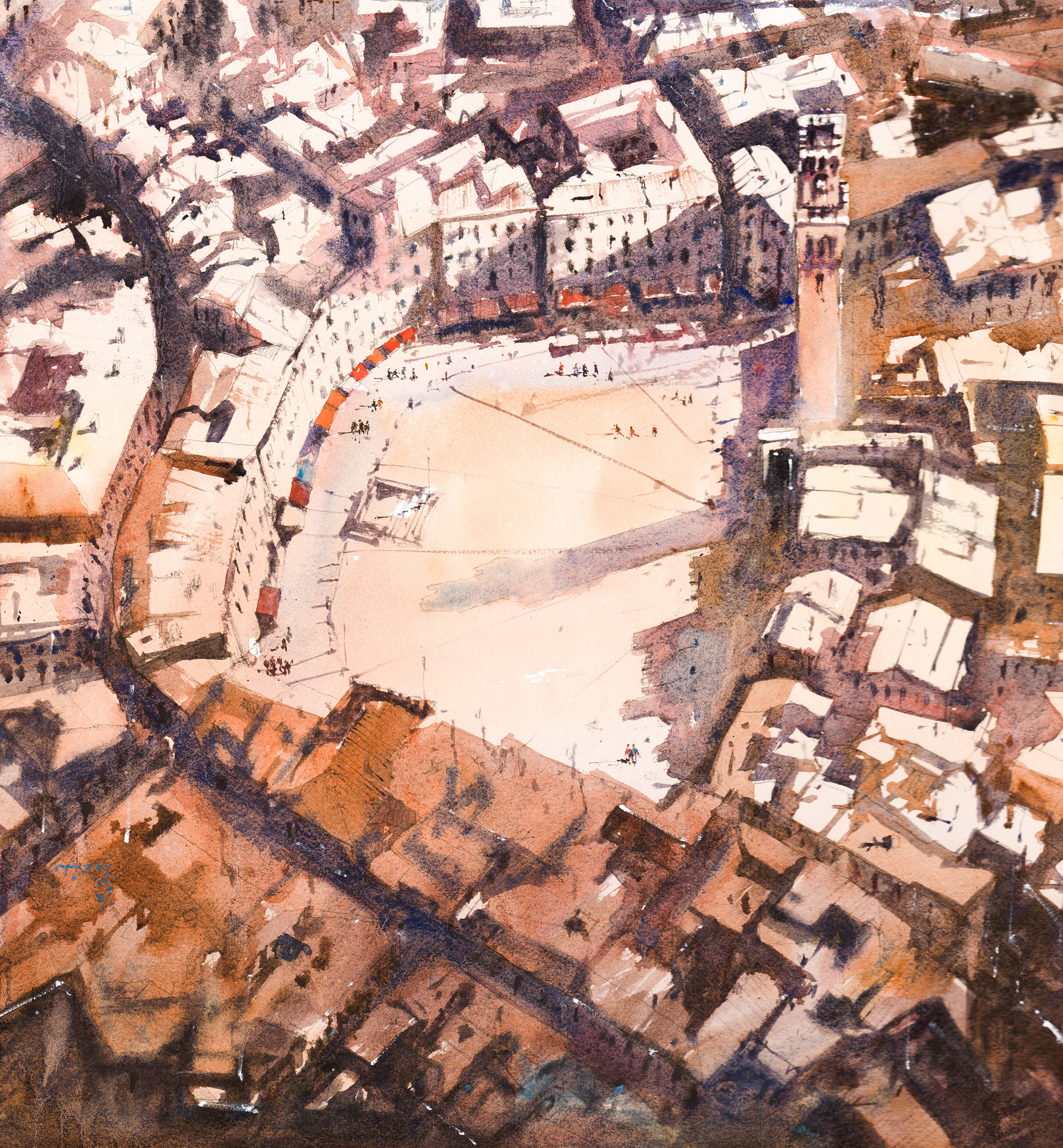 Chanyakorn describes the inspiration for his prize-winning piece: "Walking through the narrow streets of this ancient city with dim light coming from above, one feels a sense of intimacy and compression. When one reaches the Campo, the feeling of openness is amplified by the stark contrast of spatial quality, a perfect juxtaposition between the density of narrow streets and the openness of the ancient piazza. A gentle slope directs one's gaze toward the focal point punctuated by the beautiful tower reaching the open sky. With an intricate and subtle design, the Pizza del Campo is one of the best piazzas in the world."