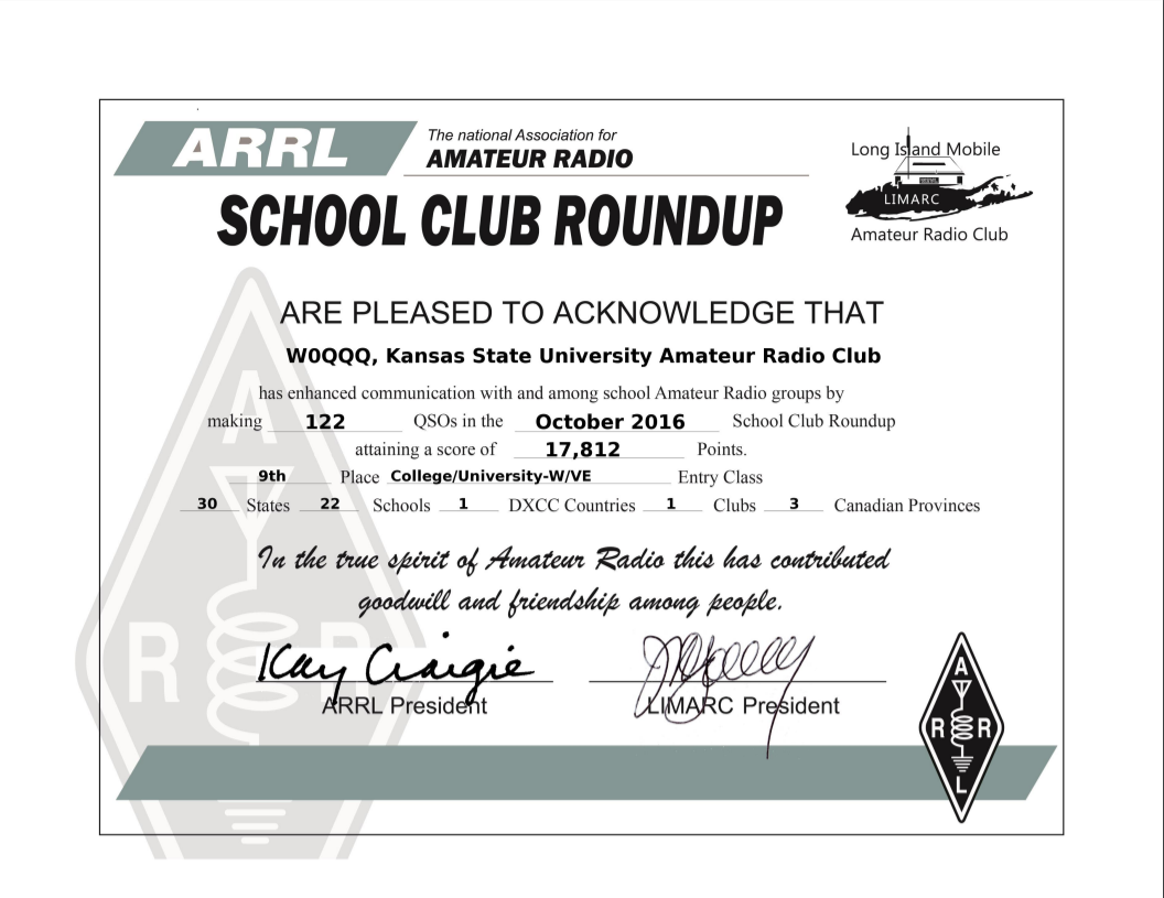 ARRL School Club Roundup Certificate, October 2016 9th place |