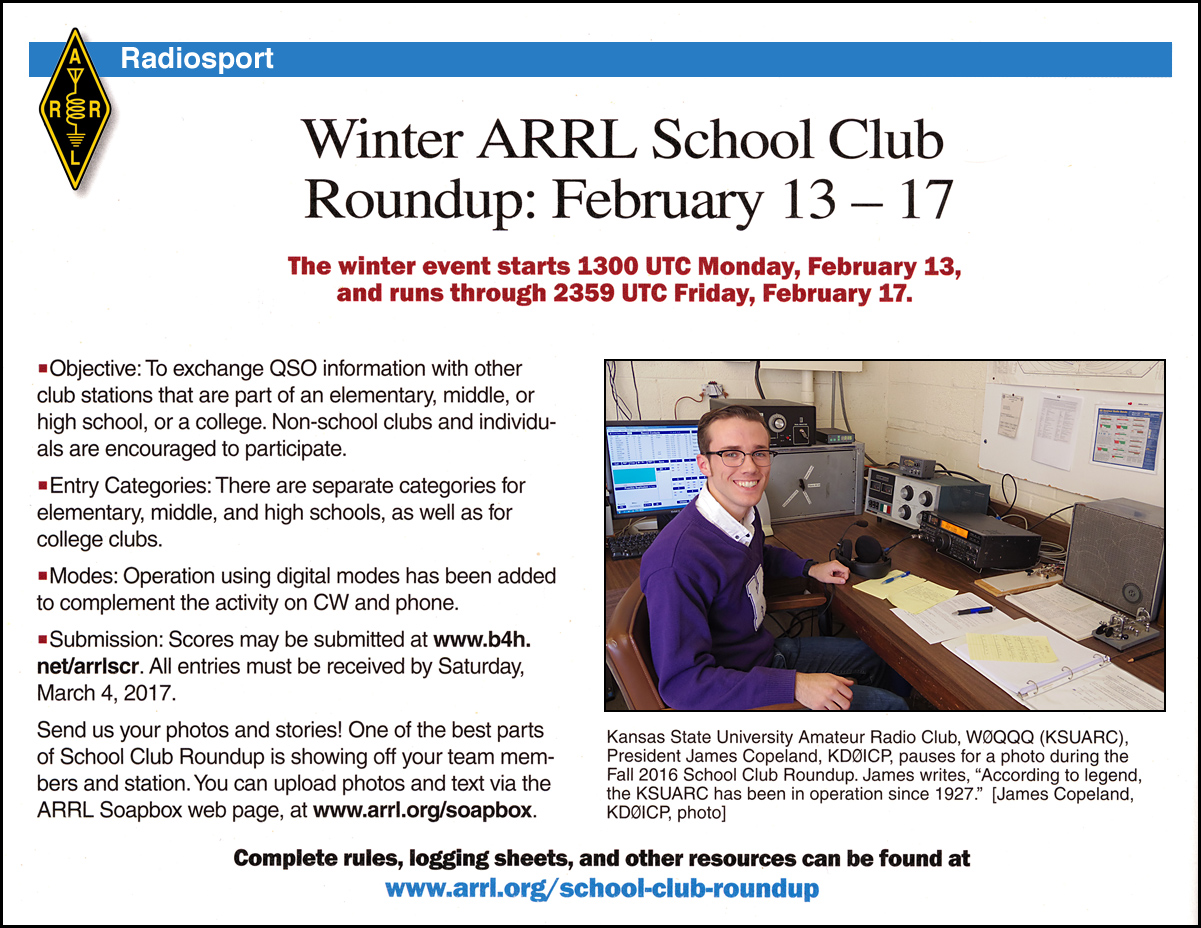 KSUARC president James Copeland, KDØICP, School Roundup promo, Jan. 2017 QST |