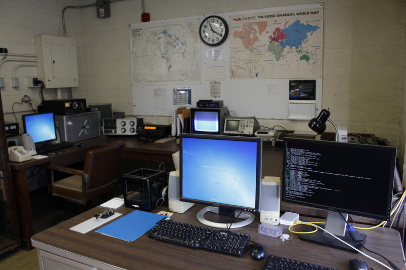 Operating Stations at WØQQQ - April 2016 Equipment includes an Icom IC-736 transceiver, NCL-2000 linear amplifier, fully-functional Commodore 64 setup with RTTY interface, and an M3D 3-D printer just for the fun of it! |